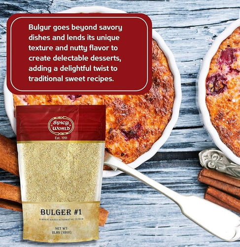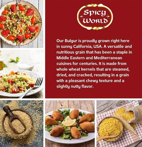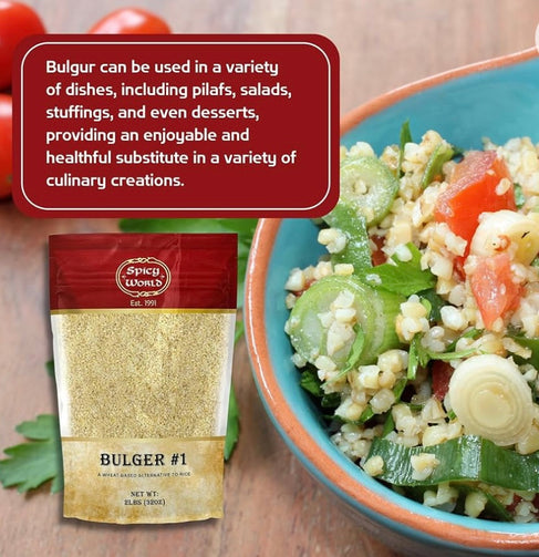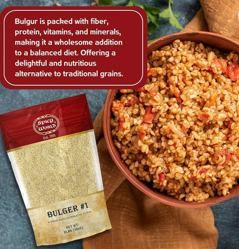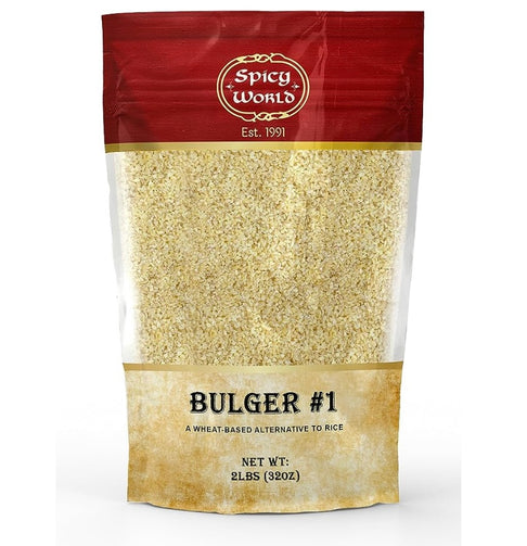 Enhance your meals with Bulgur Wheat (Cracked) – 2 lb Bag, a wholesome, 100% natural whole grain commonly used in Middle Eastern and West African cooking. Spicy World brand, fine #2.